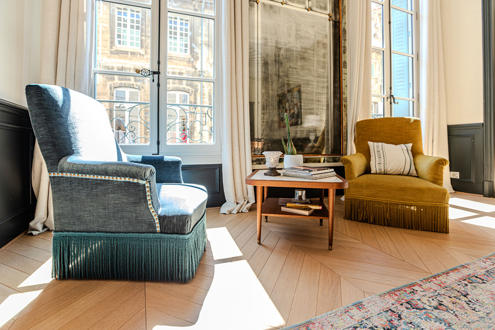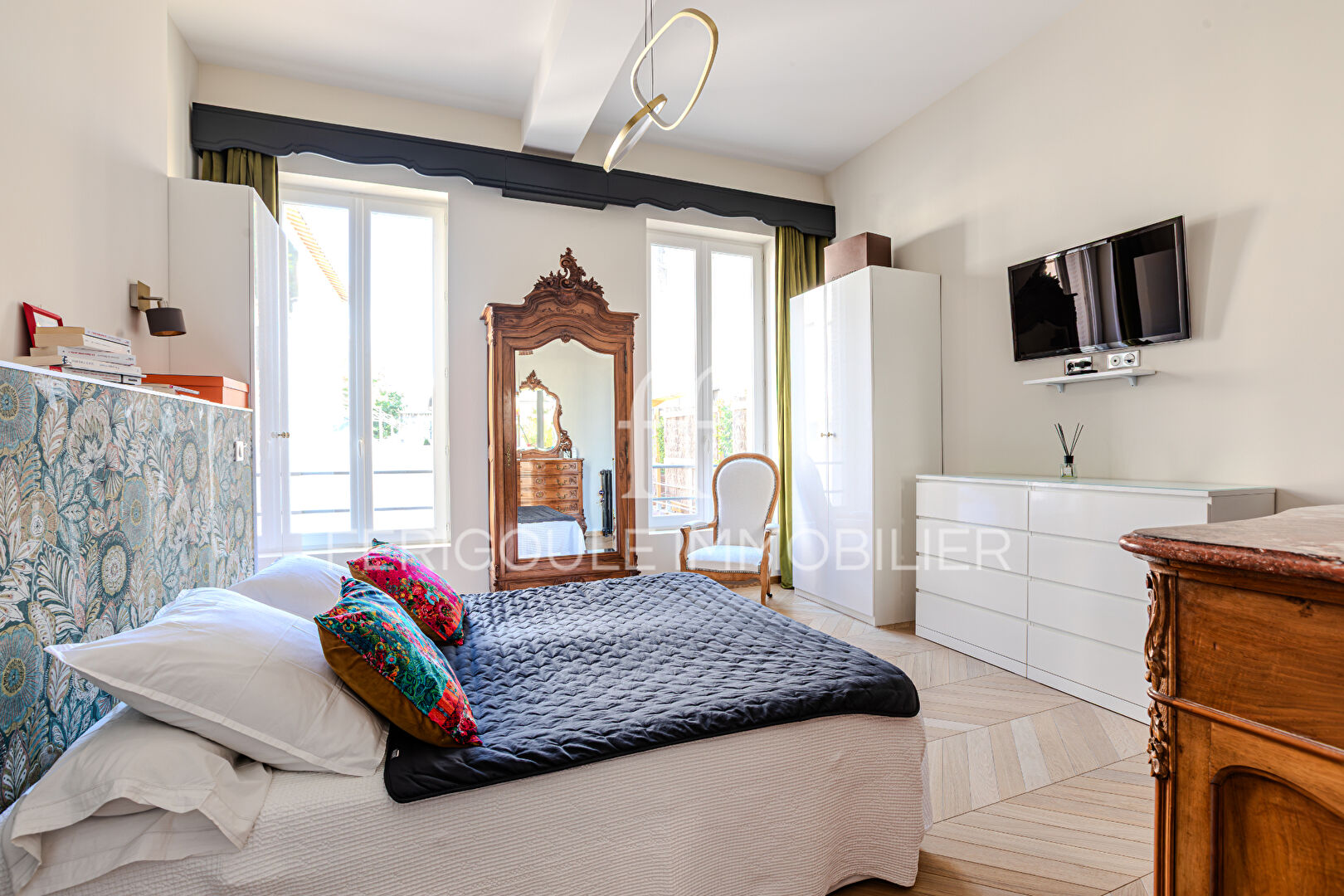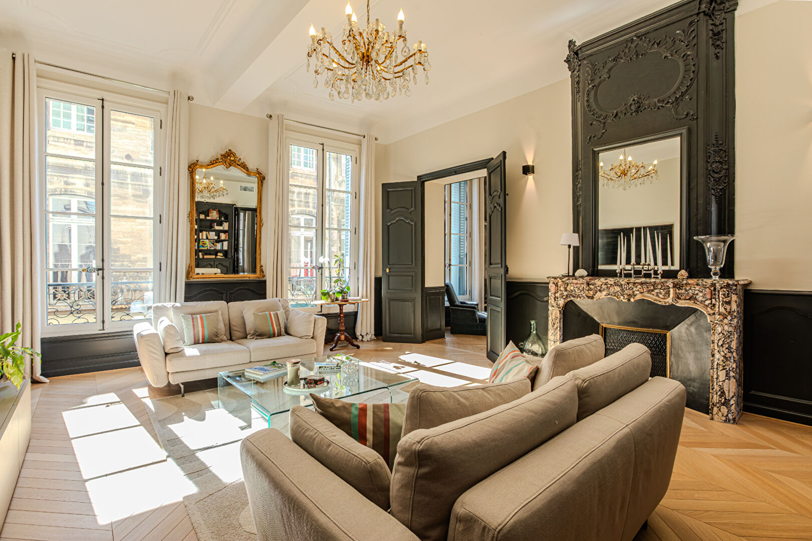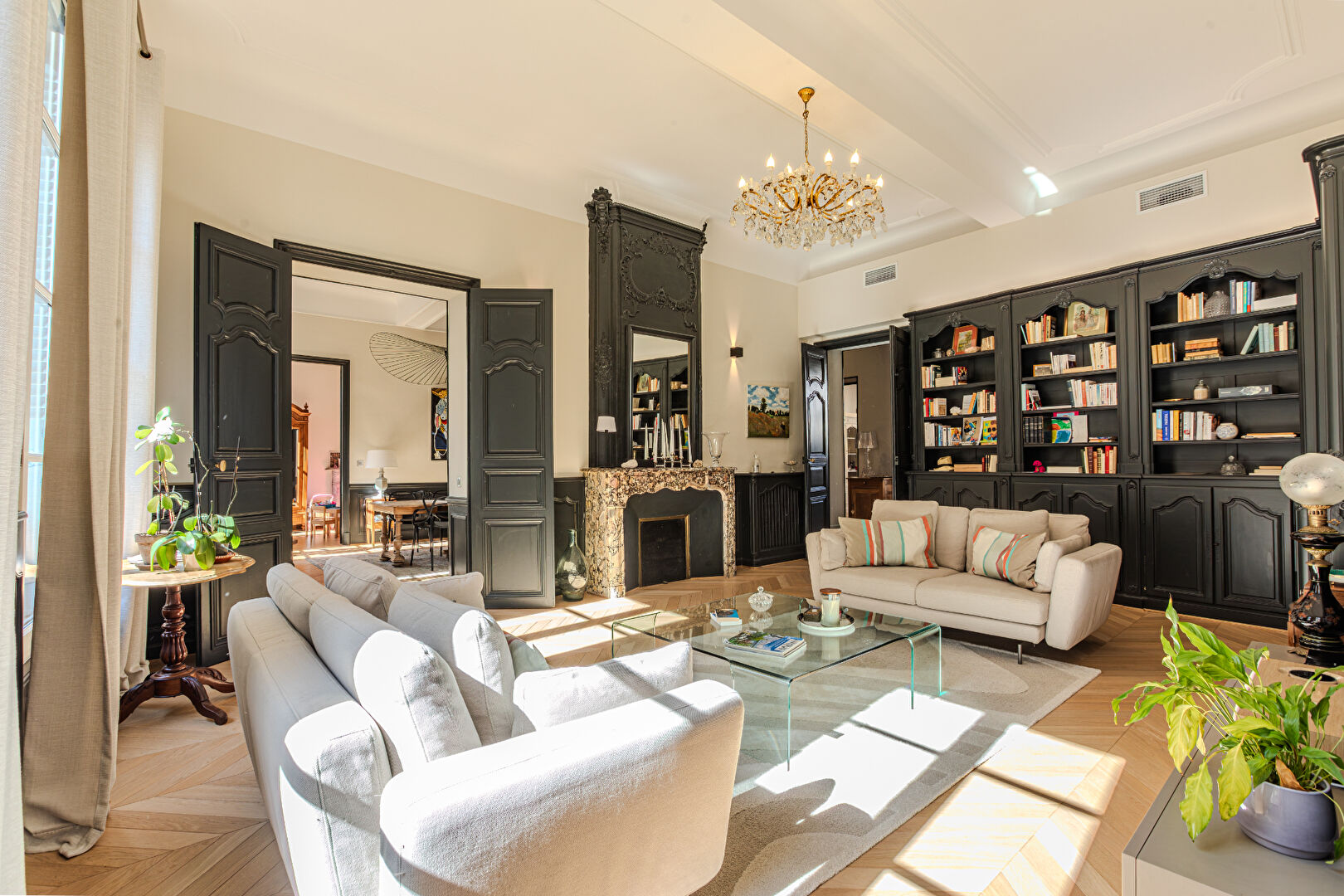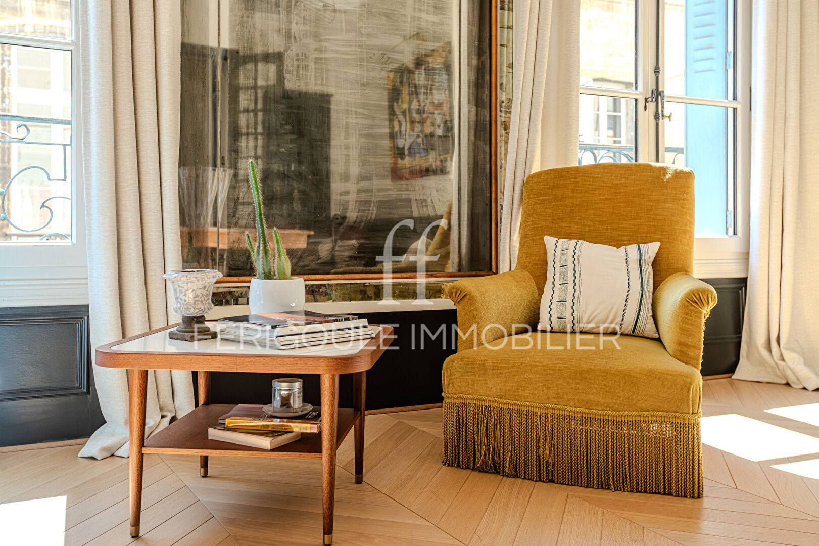Ideally situated between Place Crillon and Place de l’Horloge, this stunning first-floor apartment is nestled in a charming early 19th-century building, offering a peaceful retreat from city noise. From the moment you step inside, the spacious entrance hall sets an elegant tone, showcasing beautiful herringbone parquet floors, soaring ceilings, and refined finishes throughout.